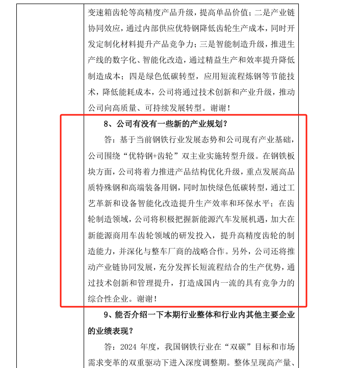 基于當前鋼鐵行業(yè)發(fā)展態(tài)勢和公司現有產業(yè)基礎,公司圍繞“優(yōu)特鋼+齒輪”雙主業(yè)實施轉型升級。在鋼鐵板塊方面,公司將著力推進產品結構優(yōu)化升級,重點發(fā)展高品質特殊鋼和高端裝備用鋼,同時加快綠色低碳轉型,通過工藝革新和設備智能化改造提升生產效率和環(huán)保水平;在齒輪制造領域,公司將積極把握新能源汽車發(fā)展機遇,加大在新能源商用車齒輪領域的研發(fā)投入,提升高精度齒輪的制造能力,并深化與整車廠商的戰(zhàn)略合作。另外,公司還將推動產業(yè)鏈協(xié)同發(fā)展,充分發(fā)揮長短流程結合的生產優(yōu)勢,通過技術創(chuàng)新和管理提升,打造成國內一流的具有競爭力的綜合性企業(yè)。