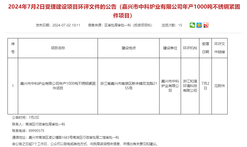 7月2日,嘉興市中科爐業有限公司年產1000噸不銹鋼緊固件項目環境影響評價報告表獲受理公告,公告期:7個工作日。